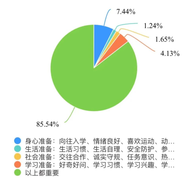 調(diào)查結(jié)果顯示,85.54%的家長(zhǎng)認(rèn)為,幼小銜接中的身心準(zhǔn)備、生活準(zhǔn)備、社會(huì)準(zhǔn)備、學(xué)習(xí)準(zhǔn)備四個(gè)方面都很重要,不能偏向于只在某一方面進(jìn)行銜接,可見一幼家長(zhǎng)具備一定的科學(xué)幼小銜接理念。