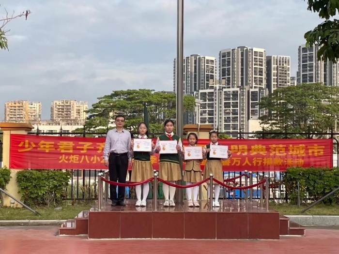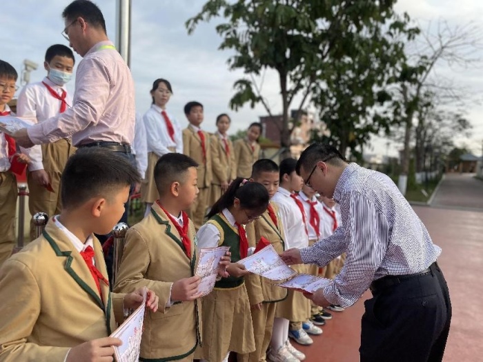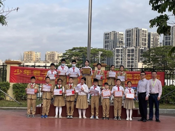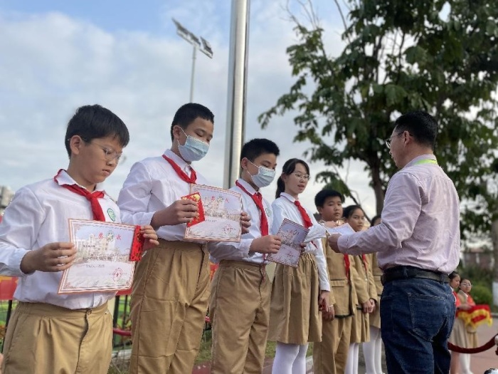 萬(wàn)校長(zhǎng)激情昂揚(yáng)的致辭結(jié)束后,“童心向黨,爭(zhēng)章逐夢(mèng)”紅領(lǐng)巾獎(jiǎng)?wù)骂C章儀式正式開(kāi)始。學(xué)校大隊(duì)輔導(dǎo)員羅秋嬋老師宣布獲得“紅領(lǐng)巾獎(jiǎng)?wù)隆钡纳傧汝?duì)員名單,授予宋玉琳等兩名少先隊(duì)員2021-2022學(xué)年“紅領(lǐng)巾獎(jiǎng)?wù)隆眰€(gè)人四星章;授予黃伊樂(lè)等少先隊(duì)員2021-2022學(xué)年“紅領(lǐng)巾獎(jiǎng)?wù)隆眰€(gè)人三星章,由萬(wàn)小兵校長(zhǎng)和鄧龍副校長(zhǎng)現(xiàn)場(chǎng)為他們頒發(fā)獎(jiǎng)?wù)隆?/p>