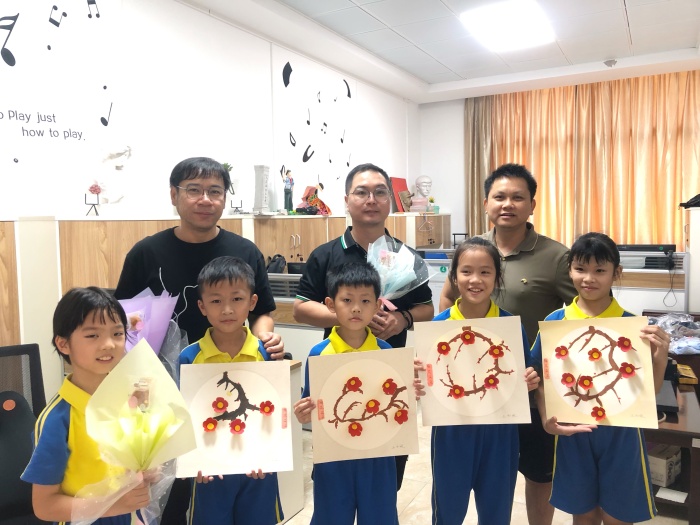 活動(dòng)伊始,學(xué)校大隊(duì)委利用紅領(lǐng)巾廣播站對(duì)全體老師的辛勤付出表示衷心的感謝,并代表全體同學(xué)為老師們送上歌曲——《念師恩》。動(dòng)人的音樂飄蕩在學(xué)校的每一個(gè)角落,濃濃的情誼流淌在每一位八小師生的心中。在音樂的伴隨下,學(xué)?!懊坊ǘ涠浒唷钡娜昙?jí)小同學(xué)手捧親自制作的藝術(shù)花束和梅花主題作品,穿梭在每一個(gè)辦公室和課室之間,他們向老師敬禮,為全校老師送上美好的祝福,笑容洋溢在每一個(gè)人的臉上,校園呈現(xiàn)出一派喜慶、熱鬧的景象。