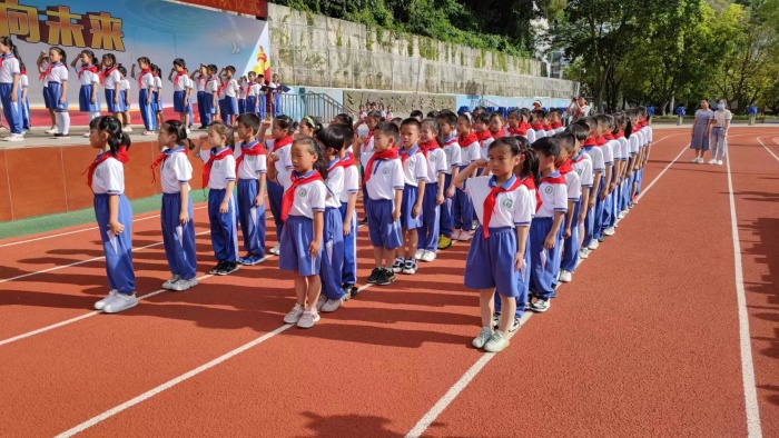上午8:30,全體隊(duì)員齊唱《中國(guó)少年先鋒隊(duì)隊(duì)歌》。在嘹亮的歌聲中,一年級(jí)新隊(duì)員入隊(duì)儀式拉開序幕。少先隊(duì)大隊(duì)輔導(dǎo)員陳一蕾老師宣讀新隊(duì)員名單,六年級(jí)的少先隊(duì)代表為一年級(jí)同學(xué)佩戴紅領(lǐng)巾,與新隊(duì)員互敬隊(duì)禮。隨后,新隊(duì)員在陳老師的帶領(lǐng)下,完成了莊嚴(yán)宣誓。張家邊社區(qū)團(tuán)委書記陳俊杰先生發(fā)表了慷慨激昂的講話,陳書記表達(dá)了對(duì)全體隊(duì)員的祝福并提出了殷切的希望。一(3)中隊(duì)的喬欣妍作為新隊(duì)員代表進(jìn)行了發(fā)言,表達(dá)了爭(zhēng)做好隊(duì)員的決心,并表示與全體隊(duì)員一起用實(shí)際行動(dòng)為隊(duì)旗添光彩。最后,入隊(duì)儀式在新隊(duì)員們響亮的呼號(hào)聲中落下帷幕。