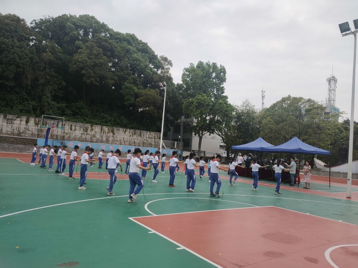 跳繩韻律操是學(xué)校體育科組原創(chuàng)編排的體操,體操把跳繩、韻律舞蹈有機(jī)結(jié)合,既是學(xué)生的跳繩水平的檢測又是對(duì)學(xué)生的律動(dòng)、節(jié)拍、協(xié)調(diào)性等全面的考驗(yàn)。本次跳繩韻律操比賽利用大課間時(shí)間開展,以班級(jí)為單位分高中低三個(gè)組別進(jìn)行。開發(fā)區(qū)第二小學(xué)黨支部書記周瑞珍校長,支委馮麗芬副校長、鄭康樂副校長全程參與比賽,為學(xué)生加油鼓勁,學(xué)校德育行政、體育科組老師擔(dān)任本次評(píng)委工作。