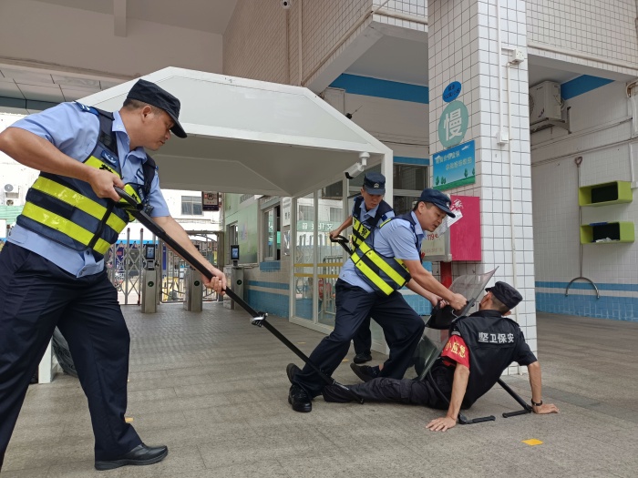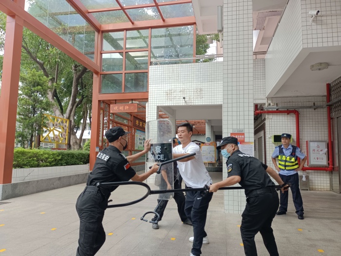 活動中,蔡成文警官帶領隊員們展示了“最小應急單元技能”基本要領,并在操作技能上作出詳細且專業(yè)的講解,其中重點教授了叉、盾、棍的組合應用,了解如何盡最大化地保護自己、制服施暴人。蔡警官還專門展示了棍法的打、掃、挑、擋的基本站姿與手法。保安處、護校隊紛紛表示學到了重要、實用的安全技能知識,大大提高了處理應急安全問題的技能與效率。最后,護校隊全體成員及保安處分別在蔡成文警官的指導下專業(yè)地進行了“最小應急單元技能”的模擬演練。