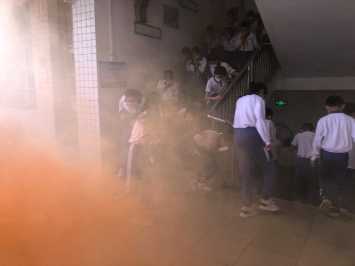 緊接著,開展了全員消防應(yīng)急疏散演練活動(dòng)。演練現(xiàn)場濃煙彌漫,急促的警報(bào)聲響起,全體師生按照演練方案即刻就位:負(fù)責(zé)疏散通道的老師們迅速到達(dá)指定崗位,班主任老師組織學(xué)生有序地撤離教室,指揮學(xué)生拿起濕毛巾捂住口鼻,彎下身子沿指定路線有序撤離,整個(gè)過程井然有序、行動(dòng)迅速,各班以最快的速度順利抵達(dá)安全區(qū)域,并整隊(duì)清點(diǎn)人數(shù),向校長匯報(bào)。