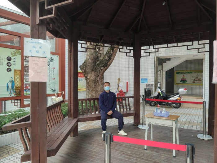 演練前,朱亮副主任詳細(xì)講解了每一個情景環(huán)節(jié)的具體操作流程,真正讓演練成為學(xué)??埂耙摺钡挠埠肆α?。演練中,“同學(xué)們”在校門口每人間隔一米有序排隊(duì),逐個進(jìn)行入校體溫檢測。由值日行政、值日教師和值班保安組成護(hù)導(dǎo)隊(duì),提醒學(xué)生保持安全距離,并對學(xué)生的體溫進(jìn)行測量、登記。體溫異常學(xué)生在值日教師的帶領(lǐng)下前往健康觀察區(qū)。隨即,校醫(yī)對學(xué)生進(jìn)行詢問、體溫復(fù)測和初步診斷,做好記錄后通知家長,由家長按要求及時把學(xué)生送到定點(diǎn)醫(yī)院并按照醫(yī)療機(jī)構(gòu)指引處理。
