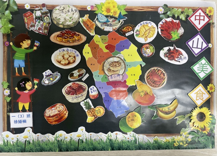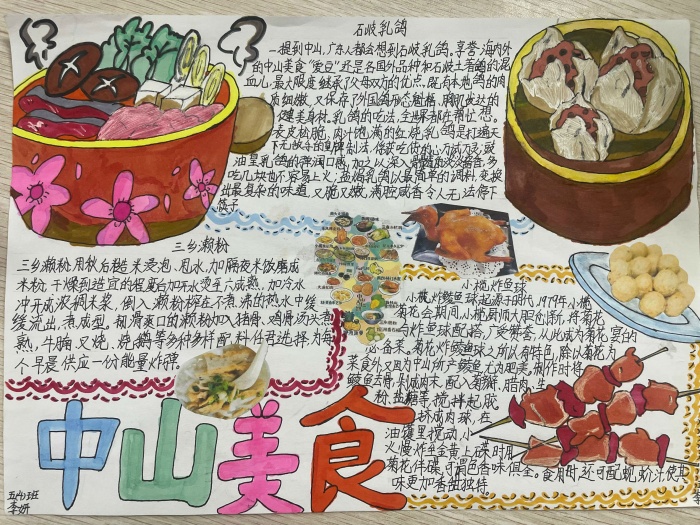 一張張栩栩如生的手抄報,呈現(xiàn)了多彩多樣的閱讀成果,有的是介紹美食的制作步驟,有的是介紹美食的歷史和地位。更有創(chuàng)意的是,有的同學制出了一份中山美食區(qū)域劃分圖,大家可以根據(jù)這份清單去打卡品嘗。