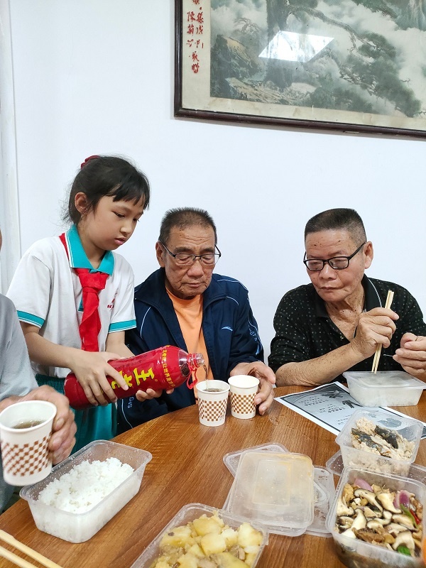 中午11點整,六小親子義工隊的家長、學生志愿者和社工等一行十多人將提前準備了葷素搭配、豐盛美味的午餐并帶到長者食堂。午餐時間到了,幾位孤寡老人像往常一樣在沙邊長者飯?zhí)脺蕚渚筒?,大家熱情地向老人家們問好,六小的少先隊員自覺攙扶老人家們?nèi)胱?。席間大小朋友們暖心地為老人家們夾菜添飯,舀湯倒飲料。在此過程中,小朋友們主動與長者們分享趣事,大朋友們親切地陪老人聊天談心,詢問老人們的日常生活需求,大家在輕松的氛圍中閑話家常,不時舉杯慶祝,氣氛融洽。一位長者表示自己許久沒有和這么多人一起吃飯聊天,今天有幸認識這么多大小朋友,倍感溫馨。飯后,六小的隊員及家長帶領長者做手指操,宣傳春季防護知識,增強春季防護意識,預防呼吸道疾病。長者們也表達了對志愿者與社工的感謝。