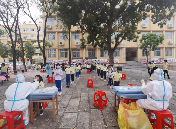 當(dāng)天下午,三小檢測(cè)現(xiàn)場(chǎng),工作人員仔細(xì)核對(duì)師生身份信息和個(gè)人防疫碼,信息登記確認(rèn)后,醫(yī)務(wù)人員嚴(yán)格按照采樣流程進(jìn)行操作。全體師生佩戴口罩,間隔1米,分時(shí)間段、分批進(jìn)入檢測(cè)點(diǎn),有序接受核酸檢測(cè),整個(gè)檢測(cè)過(guò)程有序、規(guī)范。當(dāng)天下午,該校1300余名師生全部完成了核酸檢測(cè)。