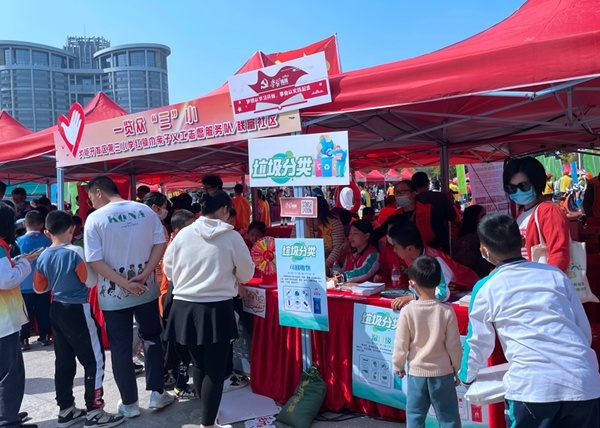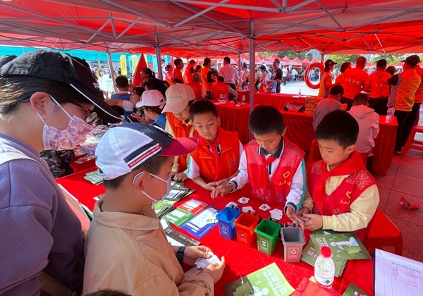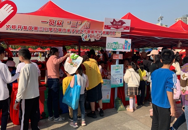 現(xiàn)場(chǎng)氣氛活躍,火炬三小的紅領(lǐng)巾宣講團(tuán)攤位,特色十足,垃圾分類展板、學(xué)習(xí)強(qiáng)國(guó)標(biāo)語(yǔ)醒目,吸引大批市民駐足。參加垃圾分類闖關(guān)小游戲和現(xiàn)場(chǎng)搜索學(xué)習(xí)強(qiáng)國(guó)節(jié)目大闖關(guān)趣味活動(dòng)的市民絡(luò)繹不絕,小志愿者們認(rèn)真引導(dǎo),忙得不亦樂乎。小小志愿者們還拿著垃圾分類的宣傳單走到攤位外面,走到人群中進(jìn)行派發(fā)和宣傳。