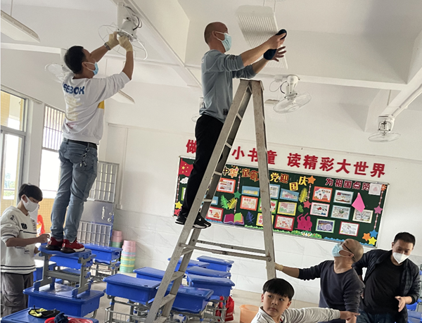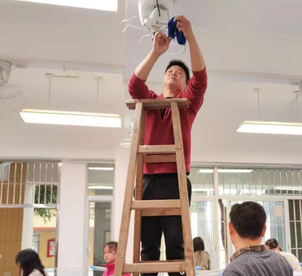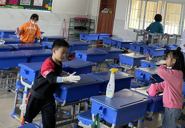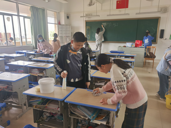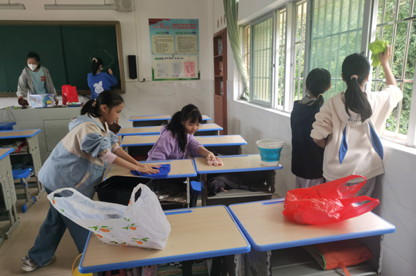 家長(zhǎng)們施展出“十八般武藝”,從風(fēng)扇、燈管,到窗戶(hù)、講臺(tái),再到桌椅、地面,從上到下不留死角,徹底清潔,把教室環(huán)境打掃得一塵不染。