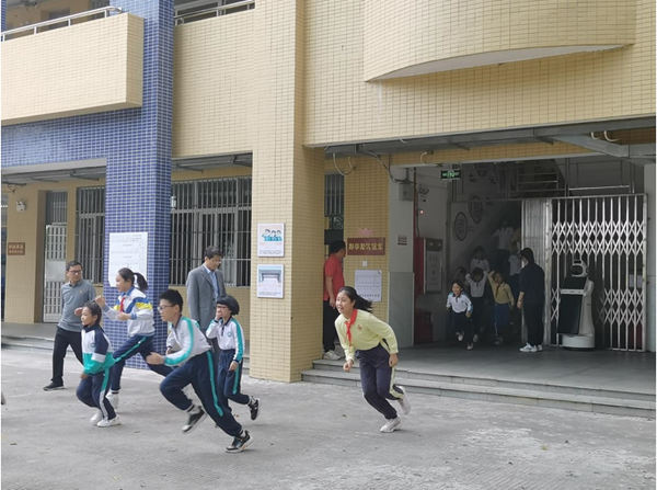 演練中,第一遍警報響起,各樓層的安全員迅速到位,各班班主任迅速組織學生,迅速躲到課桌下面,或拿書包等保護物品遮住頭部和頸部。第二遍警報響起,各班主任在黨員楊勇強校長的指揮下,迅速組織學生有序地按照規(guī)定逃生路線向外撤離疏散。撤離的過程中,學生保持著雙手護頭的姿勢,安靜有序地沖出教室。來到操場后,學生聽從指揮原地蹲在各班集合的地點,仍然保持雙手護頭的姿態(tài),班主任則迅速清點人數(shù),確保不漏一人。