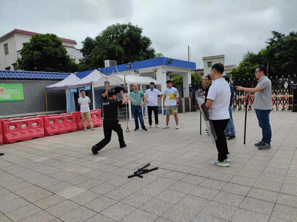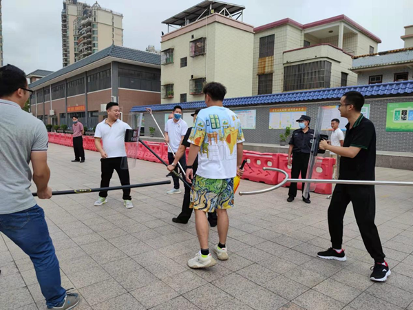 演練中,學(xué)校保安隊長吳顯田給應(yīng)急小分隊的成員詳細(xì)講解并示范了防暴棍、防暴盾牌、鋼叉等防暴器械的使用方法。大家認(rèn)真學(xué)習(xí)使用防暴器械的要訣、制服“暴徒”的要點等方面知識。