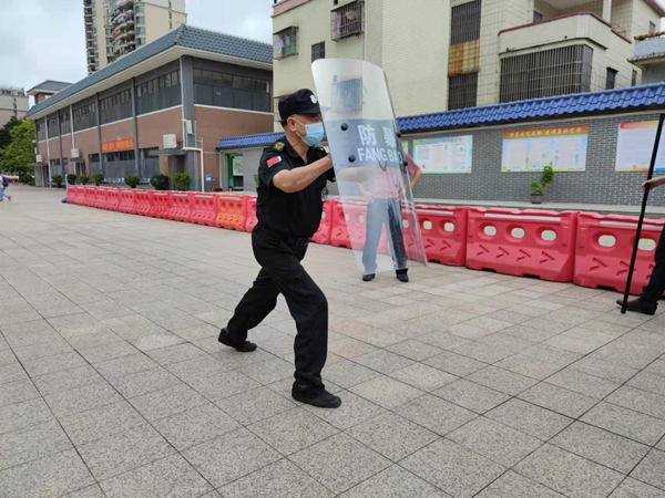 隨后黨員馮老師現(xiàn)身示范,朱老師模擬“暴徒”,應(yīng)急小分隊開展以暴徒襲擊學(xué)校的情境展開演練。當(dāng)“暴徒”試圖闖進(jìn)學(xué)校攻擊師生,教師和安保人員齊心協(xié)力,使用防暴棍、防暴盾牌等器械將“暴徒”制服。