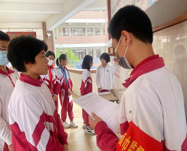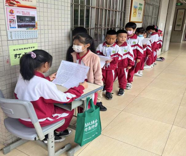 在古詩背誦小達(dá)人活動中,各班學(xué)生利用課外休息時間到課室外走廊排隊(duì)打卡,踴躍參與背古詩集印章活動。他們爭優(yōu)爭先,積極攀登背誦達(dá)人榜,掀起了古詩背誦的熱潮。