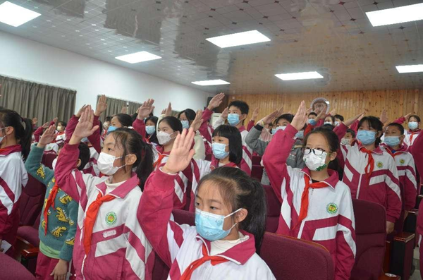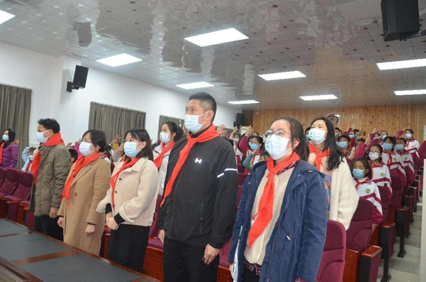 新一屆的少代會在莊嚴(yán)的少先隊儀式中拉開帷幕,鮮艷的紅領(lǐng)巾映紅了整個會場,全體參會人員莊嚴(yán)肅立,激昂歌唱,共同向隊旗致敬。