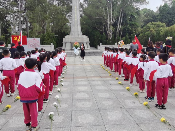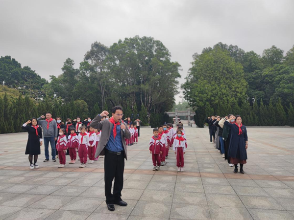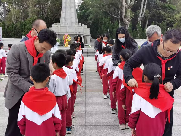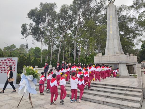 莊嚴(yán)的黨旗引領(lǐng)前行,火紅的隊(duì)旗高高飄揚(yáng),少先隊(duì)員在黨員教師的帶領(lǐng)下,身穿整潔的校服,懷著無(wú)比崇敬的心情來(lái)到中山市革命烈士陵園英雄紀(jì)念碑前。在全體人員集中列隊(duì)默哀后,祭掃先烈活動(dòng)正式開(kāi)始。