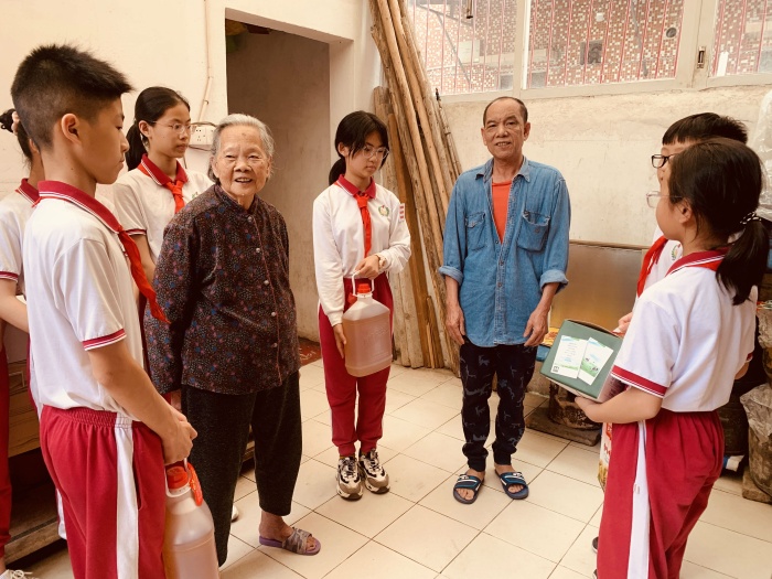 下午三點(diǎn),黃玲、錢玉兩位黨員教師帶領(lǐng)著10名少先隊(duì)員,帶著慰問(wèn)品來(lái)到老人家中。少先隊(duì)員們一邊異口同聲地問(wèn)候:“爺爺奶奶好”,一邊把慰問(wèn)品遞到老人手中。老人接過(guò)慰問(wèn)品,笑逐顏開地說(shuō)著“謝謝”!然后,少先隊(duì)員又拿起掃把打掃老人家中的院落。爺爺奶奶非常欣慰、感動(dòng)。臨走時(shí),黨員教師和孩子們千叮嚀萬(wàn)囑咐,希望爺爺奶奶日常生活小心至上,保重好身體,照顧好自己。