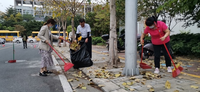 瞧!可愛的老師、家長們先對幼兒園周邊環(huán)境進行清掃,大家手拿勞動工具和垃圾袋,對散落的樹葉進行清掃,并及時排查幼兒園周邊的安全隱患。在大家相互合作、相互配合下,讓幼兒園的周邊區(qū)域變得干凈又整潔,那忙碌的身影是街道上一道靚麗的風景線。
