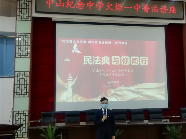 廣東中元(中山)律師事務(wù)所專職律師、中元律所春雨青少年普法中心成員高偉為同學(xué)們帶來(lái)題為《<民法典>與你同行》講座。高律師的講座分為《民法典》的立法經(jīng)過(guò)、《民法典》與你同行、預(yù)防未成年人犯罪專題三個(gè)部分。
