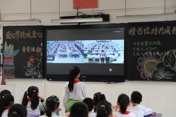 交流結(jié)束后,四(5)青葵班的劉梓萱同學(xué)還分享了自己的閱讀歷程與收獲,推薦了自己喜歡閱讀的書目,希望小伙伴們能在閱讀中找到快樂,在書中找到生命發(fā)展的力量。贈(zèng)書儀式開始了,該班全體同學(xué)紛紛高舉自己捐贈(zèng)的書籍,展示給遠(yuǎn)方小伙伴們看,希望通過網(wǎng)絡(luò)傳遞出自己那一份誠(chéng)摯的心意。
