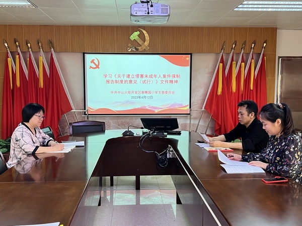 4月12日,開發(fā)區(qū)香暉園小學黨支部書記歐陽祝棣主持召開了香暉園小學黨支部委員會會議,帶領支部委員深入學習了《關于建立侵害未成年人案件強制報告制度的意見(試行)》文件精神,并要求德育處組織全校教職工開展師德師風專題培訓,務必將文件精神落到個人、落到行動、落到實處。