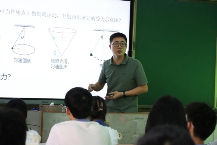 首先,朱老師在物理科組全體老師的陪同下聽(tīng)取了王永松老師的高三一輪復(fù)習(xí)公開(kāi)課《圓周運(yùn)動(dòng)的動(dòng)力學(xué)問(wèn)題》。課堂上,王老師首先引導(dǎo)學(xué)生復(fù)習(xí)了向心力的定義和向心加速度的公式,而后圍繞尋找向心力這一核心,將牛頓第二定律求合力的解法應(yīng)用到圓周運(yùn)動(dòng)中,將理想模型與生活情境相結(jié)合,為學(xué)生掌握?qǐng)A周運(yùn)動(dòng)的動(dòng)力學(xué)解法下足了功夫。整節(jié)課由易到難,層層推進(jìn),很好地完成了教學(xué)目標(biāo)。