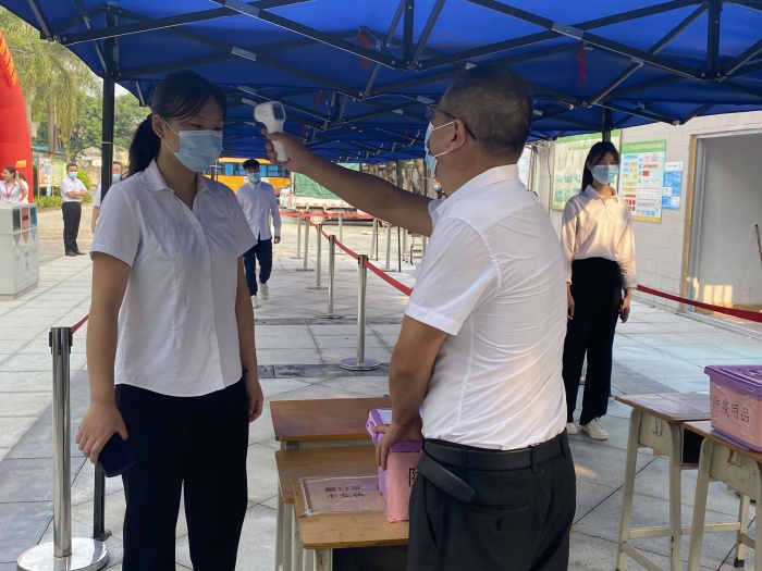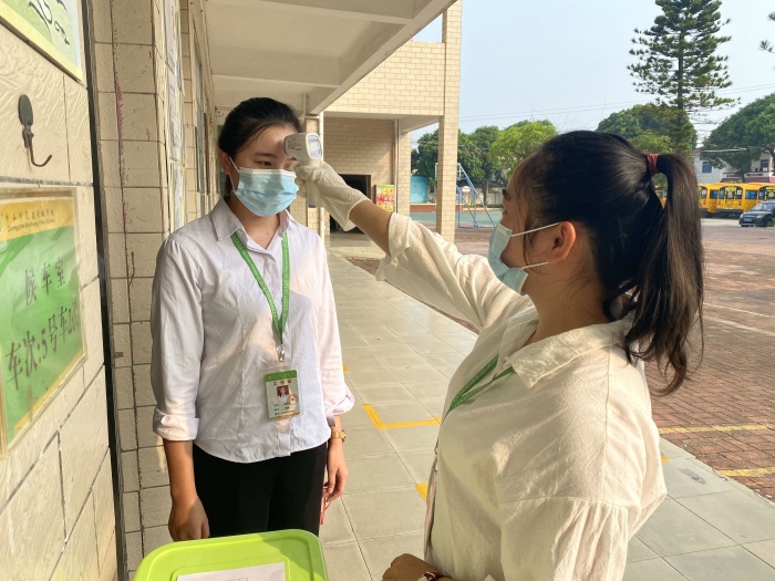上午10點整,演練正式開始。一群由班主任扮演學生通過測溫區(qū)進入校園,經(jīng)測體溫有體溫異常,學校保健員老師進行第二次測溫,核查體溫是否異常。在上課演習中,有學生身體不舒服,科任老師及時將其帶到課室外,對其測體溫并告知班主任、學生家長,隨后轉移學生到備用教室,隔離并消毒。在早上學生上校車的演習中,跟車老師一個一個學生地測體溫,體溫無異常的學生方可上校車,如有異常,立即通知學生家長。整個演練配合默契,組織有條不紊。