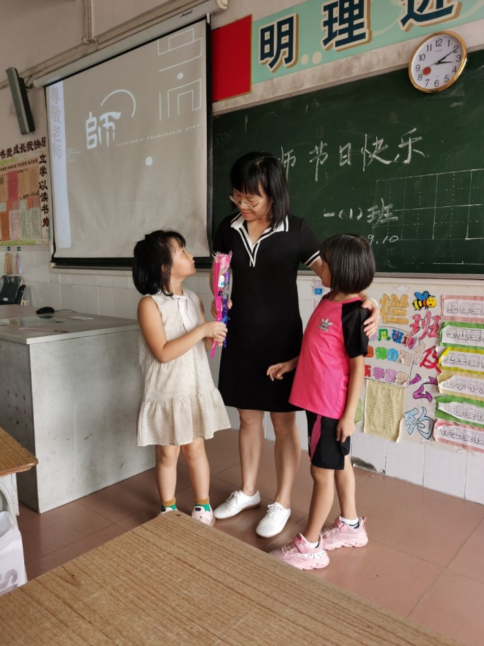 班會課上,主持人利用朗誦、歌唱、講故事、討論等多種形式來表達(dá)對老師的敬愛。首先欣賞了一首大合唱《歌聲使我們越活越年輕》,悠揚(yáng)的歌聲在教室回蕩;然后由兩個(gè)小朋友進(jìn)行了詩歌朗誦《誦師恩》,他們稚嫩的童聲,凝聚成真誠的祝福,獻(xiàn)給了我們老師,同時(shí)贏得了同學(xué)們熱烈的掌聲。在班會的最后,同學(xué)們?yōu)槔蠋煫I(xiàn)上了自己的禮物……