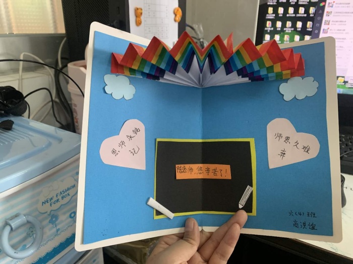 9月10日上午,三民學校大隊輔導員譚瓊老師組織了各班的代表,進行節(jié)日賀卡的制作。在譚老師的引導下,少先隊員們各出奇招,設計出不少新穎別致、富含節(jié)日寓意的賀卡,大家還代表班級把這些賀卡親自送到各位老師的手中,向辛勤耕耘的老師表達濃濃的感恩之情。此外,學校廣播站還利用中午的時間,把同學們的祝福通過廣播傳遍三民學校的每一個角落,營造出濃濃的教師節(jié)氛圍。