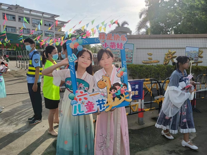 早上7點(diǎn),少先隊(duì)員身穿漢服手舉精美拍照相框在校門口送歡樂(lè),讓學(xué)生進(jìn)入校園的這一刻就能感受到歡樂(lè)輕松的“六一”氛圍。