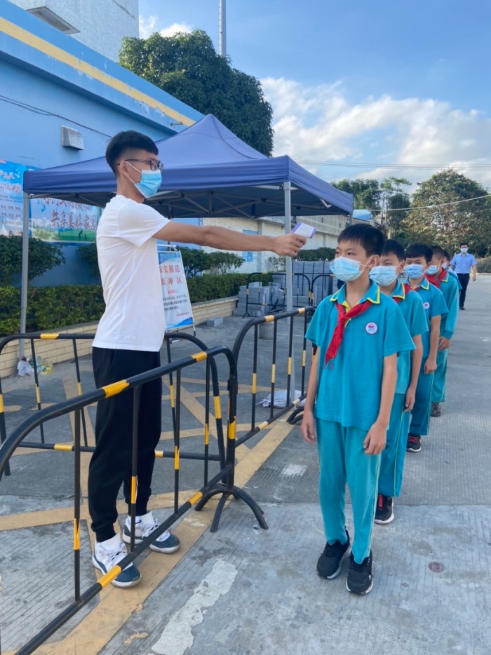 下午3:30點,演練正式開始,陸銳勛校長為本次演練的總指揮;本次分為4個主要的演練內(nèi)容,第一:早上乘校車演練;乘車學(xué)生戴好口罩,學(xué)生之間前后保持1米距離排隊候車,校車跟車員按順序為學(xué)生測溫,體溫正常(低于37.3度)才允許乘車。第二:師生進(jìn)校演練;師生佩戴好口罩,有序地排隊,然后依次測溫進(jìn)校。如發(fā)現(xiàn)學(xué)生體溫異常,應(yīng)急處置老師聯(lián)系衛(wèi)生應(yīng)急處置員,衛(wèi)生應(yīng)急處置員將體溫異常的學(xué)生帶到隔離室復(fù)測體溫,體溫是異常的應(yīng)致電班主任,并按衛(wèi)生應(yīng)急處置員按流程規(guī)范處置。第三:食堂就餐演練;上午放學(xué)后,當(dāng)班老師組織本班學(xué)生排好隊戴好口罩向食堂出發(fā),原則上按低年級到高年級順序安排領(lǐng)餐餐,學(xué)生進(jìn)入飯?zhí)煤?,按前后相?米排隊領(lǐng)餐,取餐后回到各自的教室座位就餐。第四:午休測溫和上課出現(xiàn)異常應(yīng)急演練;如有學(xué)生舉手報告身體不舒服,上課老師安排好其他學(xué)生自學(xué)任務(wù)后,給報告者測體溫,體溫異常的致電班主任,班主任相隔1米,帶學(xué)生到留觀室。班主任通知衛(wèi)生管理員到留觀室處置,衛(wèi)生管理員按流程規(guī)范進(jìn)行處置。