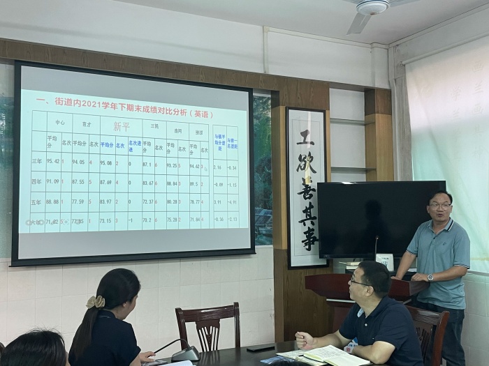 然后,英語科組長吳照輝老師對英語科組近三年的整體成績進(jìn)行簡要的分析,他指出近三年新平小學(xué)三、五、六年級英語成績較好,平均分排位居本鎮(zhèn)前列,四年級成績中等偏下,針對此情況,英語科組制定出具體的改進(jìn)措施,并且提醒科組老師相互借鑒方法、分享資源 ,特別在加大培優(yōu)輔差的力度、關(guān)注學(xué)困生等方面進(jìn)行剖析。