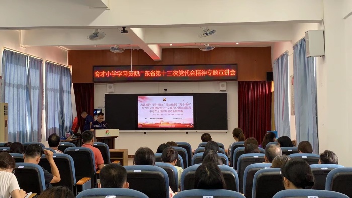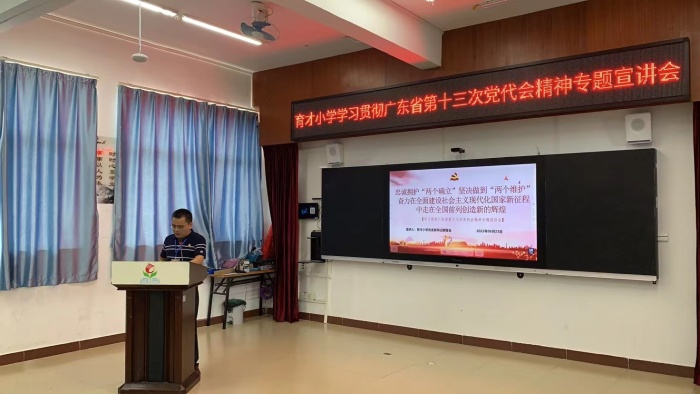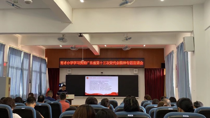 6月23日下午,育才小學(xué)黨支部在學(xué)校會(huì)議室召開教師大會(huì)進(jìn)行專題宣講,深入學(xué)習(xí)宣傳貫徹廣東省第十三次黨代會(huì)精神。學(xué)校黨支部書記、校長(zhǎng)胡留全上專題黨課,全體教師參加會(huì)議。