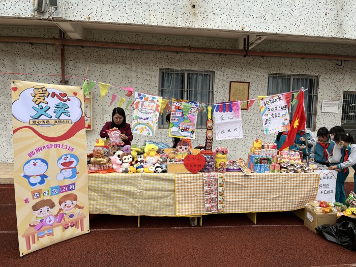 各班級(jí)在學(xué)校指定的區(qū)域內(nèi)搭建起了各自的商品攤位。攤位上有同學(xué)們平時(shí)閑置的玩具、圖書(shū)、文具、食品以及工藝品等,各類義賣物品應(yīng)有盡有。