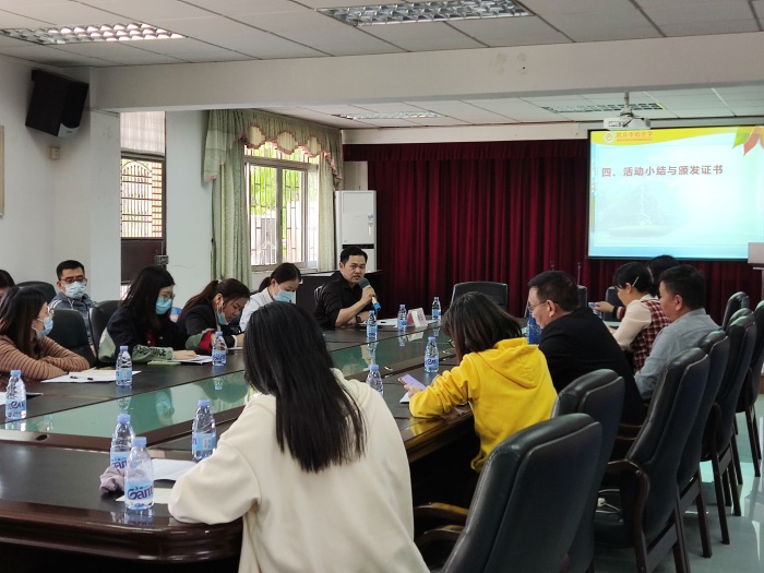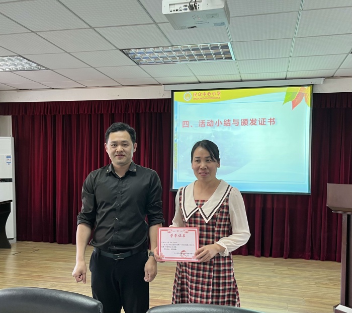 課后,活動(dòng)參與人員移步至民眾中心小學(xué)接待室參與評(píng)課議課,交流分享“愛(ài)種子”語(yǔ)文課堂教學(xué)經(jīng)驗(yàn)。首先,許妃五老師就展示課進(jìn)行了課后反思,聽(tīng)課教師也紛紛發(fā)表自己的看法和建議,肯定了“愛(ài)種子”把課堂還給學(xué)生的課堂教學(xué)模式。接著,領(lǐng)教員黃翠碧老師分享了“愛(ài)種子”課堂教學(xué)的經(jīng)驗(yàn)和學(xué)習(xí)心得,展示了小組合作“七字訣”,強(qiáng)調(diào)要以學(xué)生為主體,課堂中注意培養(yǎng)學(xué)生的合作意識(shí)、創(chuàng)新精神、加強(qiáng)直觀教學(xué),培養(yǎng)學(xué)生實(shí)踐能力。最后,民眾街道教育和體育事務(wù)中心鐘偉云主任對(duì)本次活動(dòng)作小結(jié),并為許妃五老師頒發(fā)證書(shū)。