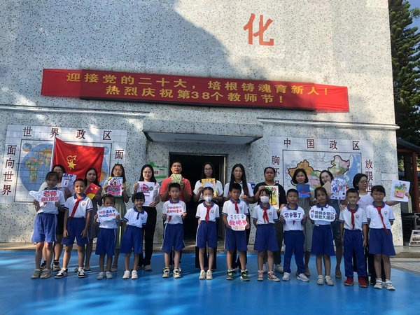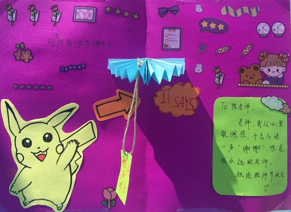 接著少先隊(duì)員代表們向教師送上自己親手制作的賀卡、繪畫,并祝福老師們節(jié)日快樂!