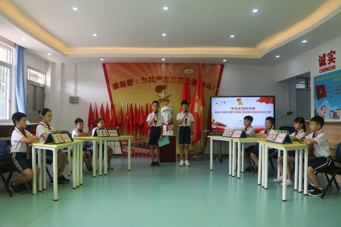 隨后,全體師生觀看了云衢小學(xué)少先隊(duì)“爭做文明傳承者”創(chuàng)建文明城市知識大賽。本著“我知曉、我參與、我奉獻(xiàn)、我行動”的宗旨,參賽隊(duì)員們積極準(zhǔn)備,熟記題庫,積極參與,你爭我搶的回答、擲地有聲的聲音,場面十分熱鬧。觀賽的隊(duì)員也感染了起來,不停地喝彩。