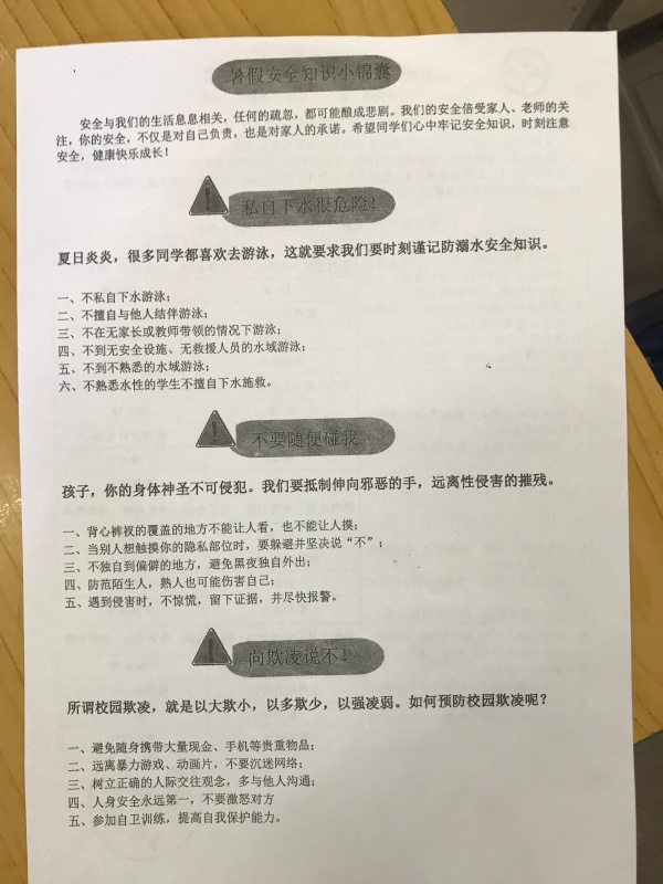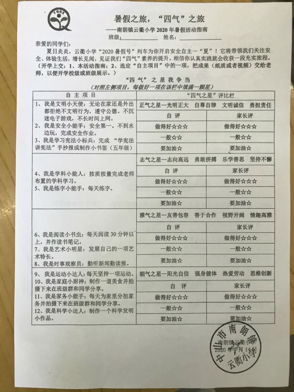在學(xué)校下發(fā)的《2020年暑假活動(dòng)指南》中,圍繞暑假進(jìn)行“四氣之星”的評(píng)比,德育處設(shè)立了“安全小錦囊”的提示,要求同學(xué)們對(duì)照要求爭(zhēng)當(dāng)安全少年。在多種形式的教育中,同學(xué)們必定將“安全”二字牢牢記于心中,并實(shí)踐于暑假,共度愉快、充實(shí)、文明、安全的假期之旅。