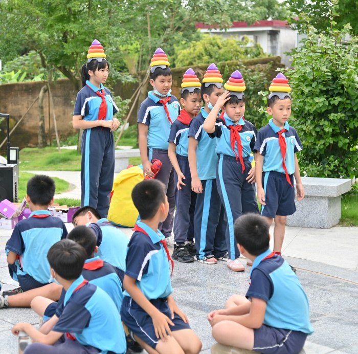 參觀寮后村后,同學們在公園的空地上圍成一圈,主動大方地介紹著自己的姓名、班級和愛好,氣氛熱烈。隨后,心理老師帶領著孩子們開展心理團建活動。第一項是投環(huán)活動,同學們井然有序地排著隊,把手中的圈往特定的柱子拋去,他們臉上都洋溢著燦爛的笑容;第二項是彩虹塔帽,同學們小心翼翼地把塔帽戴在頭上后,輕手輕腳地往前走著。第三項活動是袋鼠跳,一聲哨響,同學們像袋鼠似的不停地往前跳,奮力地沖過終點。