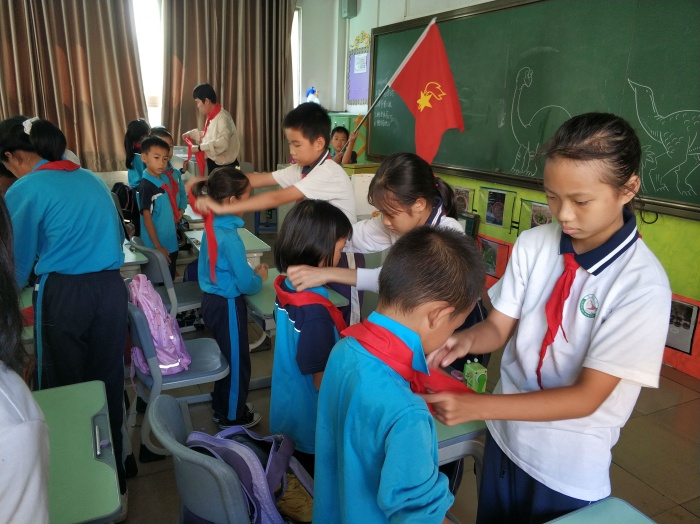 紅領巾是少先隊的標志,代表著紅旗的一角,是用無數(shù)革命先烈的鮮血染成的。良都小學少先隊大隊認真學習《少先隊改革方案》內(nèi)容,組織隊干對低年級進行少先隊禮儀培訓,教低年級隊員系紅領巾。此外,良都小學少先大隊還開展了 “我是節(jié)約小能手”月餅盒回收活動,響應黨“厲行節(jié)約,反對浪費”的號召。各中隊輔導員則組織隊員開展“我和隊旗合個影”活動,向隊旗表達自己的敬意。