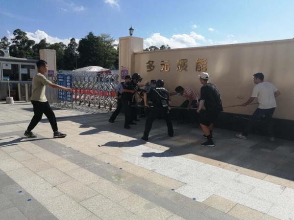 演練前,轄區(qū)派出所民警會(huì)同學(xué)校負(fù)責(zé)人和相關(guān)人員對(duì)演練內(nèi)容、演練保障、演練安全等問(wèn)題進(jìn)行了探討交流。下午4點(diǎn),何廣志校長(zhǎng)宣布反恐防暴安全演練正式開(kāi)始。“歹徒”趁機(jī)闖入校園,值勤保安利用一鍵報(bào)警進(jìn)行報(bào)警,同時(shí)發(fā)出警報(bào),提醒教師組織全體學(xué)生保持鎮(zhèn)靜,快速引導(dǎo)學(xué)生到安全區(qū)域,做好防護(hù),安全躲避。學(xué)校安全組成員聽(tīng)到警報(bào)馬上趕到現(xiàn)場(chǎng),協(xié)同保安人員手持警棍、防衛(wèi)器械等與“歹徒”周旋,最后配合趕到現(xiàn)場(chǎng)的民警將“歹徒”按倒在地,將其制服。