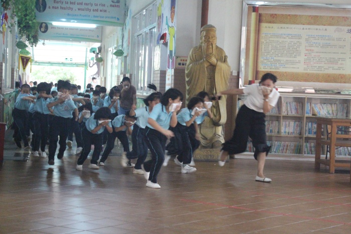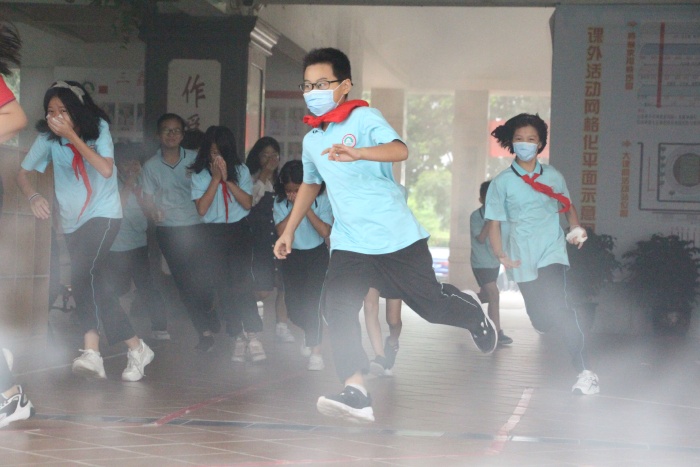 8時50分,各樓層突然濃煙四起,警報聲響徹校園,各位老師按照預案的要求各就各位,所有學生在老師的組織下,迅速把毛巾或紙巾打濕,按照平時指定的路線彎腰前進,有序疏散到了安全的地點。