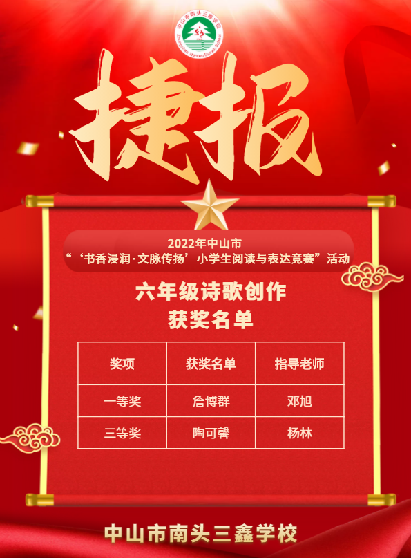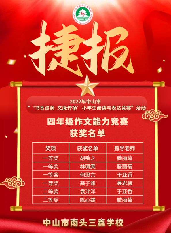 本次賽事包括四年級作文競賽、五年級閱讀能力競賽、六年級詩歌創(chuàng)作競賽。比賽結(jié)果于12月10日公布,中山市南頭三鑫學(xué)校喜獲佳績,捷報(bào)頻傳。