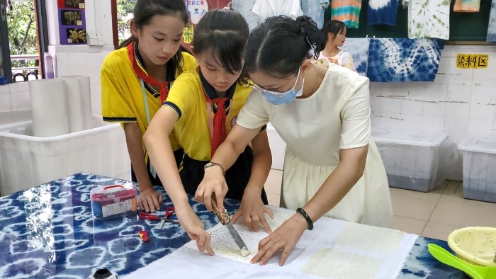 “擷撮采線結(jié)之,而后染色。即染,則解其結(jié),凡結(jié)處皆原色,余則入染矣,其色斑斕”。這是對中國民間傳統(tǒng)染色技藝扎染的生動描繪,扎染是中國民間傳統(tǒng)的染色工藝。2006年扎染技藝經(jīng)國務院批準,入選國家非物質(zhì)文化遺產(chǎn)。2016年,南頭華暉學校將這項傳統(tǒng)工藝引進校園,開展扎染社團,2020年扎染進課堂,學生在日常學習中就能體驗扎染藝術(shù)的魅力,成為南頭華暉學校獨具特色的傳統(tǒng)工藝教學課程。