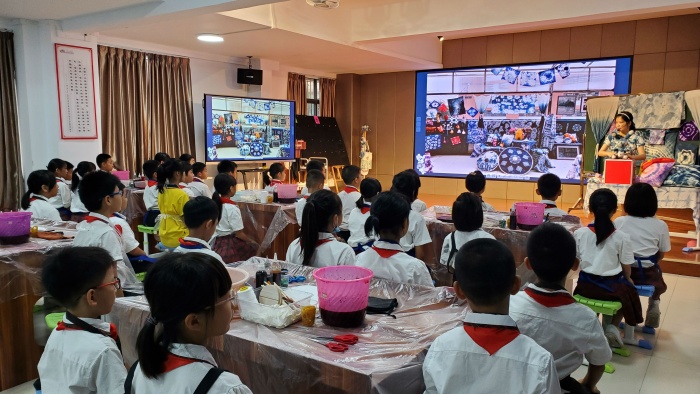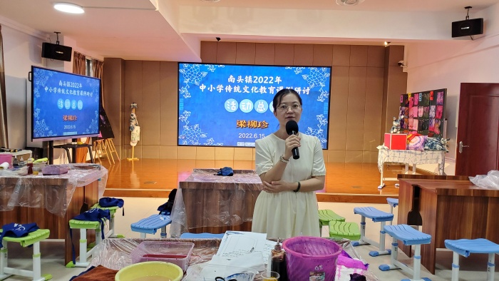 為了進一步貫徹落實教育部《完善中華優(yōu)秀傳統(tǒng)文化教育指導綱要》和 《中山市教育和體育局關(guān)于落實<中山市傳承發(fā)展中華優(yōu)秀文化實施方案>工作方案》的要求,加強南頭鎮(zhèn)傳統(tǒng)文化傳承與發(fā)展工作,6月15日下午,南頭鎮(zhèn)2022年中小學傳統(tǒng)文化教育課例研討活動在華暉學校舉行。參加本次活動的有南頭鎮(zhèn)教育和體育事務中心教研員梁柳珍老師,南頭鎮(zhèn)傳統(tǒng)文化科組中心組組長徐曉娟老師,以及各學校傳統(tǒng)文化教育負責人、鎮(zhèn)傳統(tǒng)文化工作室成員代表。本次活動主題為:“邂逅扎染之美,傳承非遺文化”。