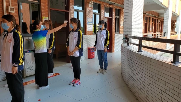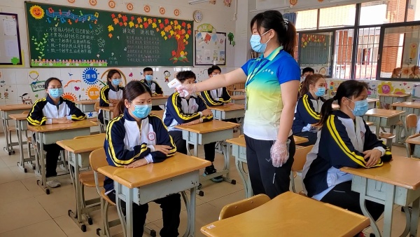 情境一,學(xué)生按年級(jí),分時(shí)段,按指定路線進(jìn)校園晨檢。保安在門口維持秩序,學(xué)生間隔一米排隊(duì)進(jìn)校,值周行政、值周教師在校門口有序引導(dǎo)學(xué)生測(cè)體溫。發(fā)現(xiàn)某生體溫高于37.3℃,交由校保健老師引導(dǎo)到臨觀室撫慰、復(fù)核,盡力避免孩子緊張恐懼。確定是發(fā)燒癥狀,按規(guī)定流程處置。