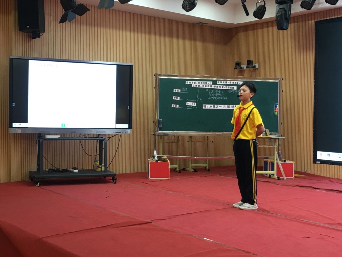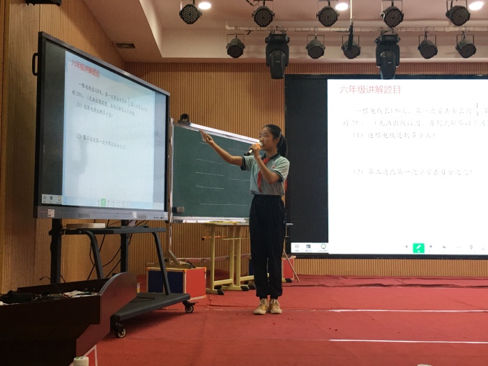 看!一個(gè)個(gè)小老師精神飽滿、自信大方、聲音洪亮,講起題目思路清晰,頭頭是道!四年級(jí)的小選手率先展示,從讀題到分析題意、梳理信息,有序地畫線段圖,表述出每一條算式所表示的意義。六年級(jí)的小選手圍繞“分率問題”,巧妙地借助線段圖來把對(duì)應(yīng)的數(shù)學(xué)信息進(jìn)行整理、分析,借助學(xué)具的展示、板書的設(shè)計(jì),把要講解的題目條理清晰、層層有序地表達(dá)出來、展示出來,他們落落大方的講解贏得在座教師的一致好評(píng)。