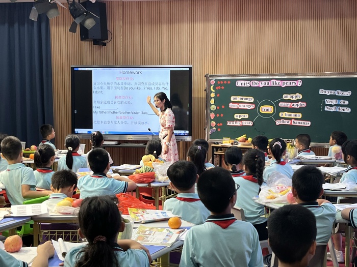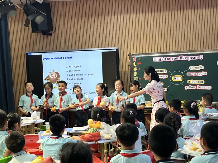本次研討活動(dòng)圍繞南頭鎮(zhèn)民安小學(xué)英語科組盧麗萍老師的課例展開,盧老師上課內(nèi)容是人教版三年級(jí)下冊(cè)u(píng)nit5《 Do you like pears?》Part A Let’s learn&let’s chant,盧老師緊扣教學(xué)重難點(diǎn),有效整合智慧平臺(tái)上的豐富資源,設(shè)計(jì)了豐富多彩的聽、說、讀、寫等語言活動(dòng)。學(xué)生們?cè)隗w驗(yàn)、練習(xí)和交流中習(xí)得語言;在任務(wù)驅(qū)動(dòng)下進(jìn)行小組合作探究并運(yùn)用語言;通過繪本閱讀拓展知識(shí)和深化語言。整堂課教學(xué)內(nèi)容充實(shí),教學(xué)環(huán)節(jié)緊密相扣,層層遞進(jìn),學(xué)生們?nèi)掏度肫渲胁⒋竽懕磉_(dá)自己的想法。