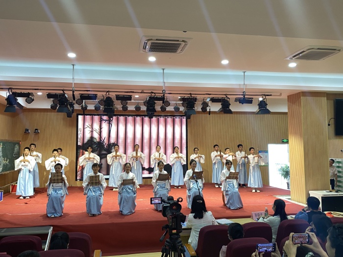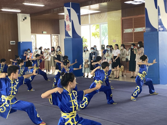 隨后,老師們駐足在葡萄園欣賞由一年級學(xué)生帶來的《百家姓》吟唱表演,在小導(dǎo)游的帶領(lǐng)下還來到了尚武館,共同欣賞學(xué)校最具特色的武術(shù)表演。表演中,孩子們動作靈活,如雛鷹展翅,熱情奔放,似猛虎下山,虎虎生威,如凌波踏浪,又似蛟龍出水,一招一式震撼人心,老師們不由自主地拍手稱贊。接著,與會老師在學(xué)校報告廳觀看了各年級的經(jīng)典國學(xué)展演。展演中,一篇篇耳熟能詳、膾炙人口的經(jīng)典國學(xué),伴隨著音樂,伴隨著同學(xué)們不同的形式的精彩演繹,注入了新鮮的血液。