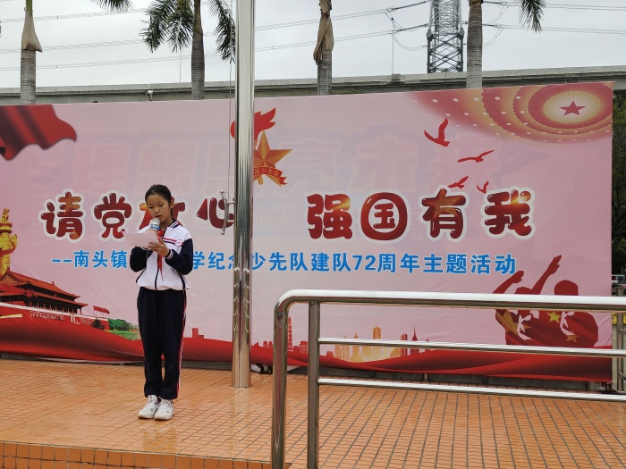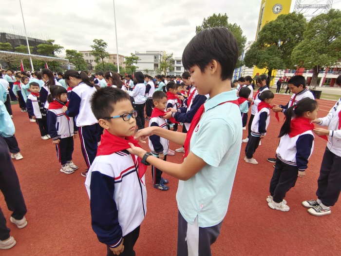 入隊儀式由民安小學(xué)少先隊大隊部大隊長吳琦隊員主持,隨著她的正式宣布,新隊員入隊儀式拉開序幕。在六2中隊趙婷婷隊員的指揮下,全校少先隊員歌唱嘹亮的《中國少年先鋒隊隊歌》。少先隊輔導(dǎo)員吳秀霞老師宣布了入隊決定:同意張明鑫等188名新隊員加入中國少年先鋒隊,成為一名光榮的少先隊員!宣布決定之后,五、六年級優(yōu)秀隊員們?yōu)樾律傧汝犼爢T佩戴了鮮艷的紅領(lǐng)巾。在鮮艷的隊旗下,大隊輔導(dǎo)員吳秀霞老師帶領(lǐng)新隊員莊嚴(yán)宣誓。優(yōu)秀少先隊代表六4中隊黃雅婷隊員提醒新隊員,紅領(lǐng)巾來自五星紅旗的一角,新隊員們要好好愛護紅領(lǐng)巾并為它增添光彩。民安小學(xué)少工委副主任李威主任發(fā)言強調(diào):希望全體少先隊員們用優(yōu)秀少先隊員的標(biāo)準(zhǔn)嚴(yán)格要求自己,努力培養(yǎng)自己的創(chuàng)新精神,鍛煉自己的實踐能力,從小養(yǎng)成良好的學(xué)習(xí)、生活和品行習(xí)慣,把自己鍛煉成為有理想、有道德、有文化、有紀(jì)律的新時代好少年。