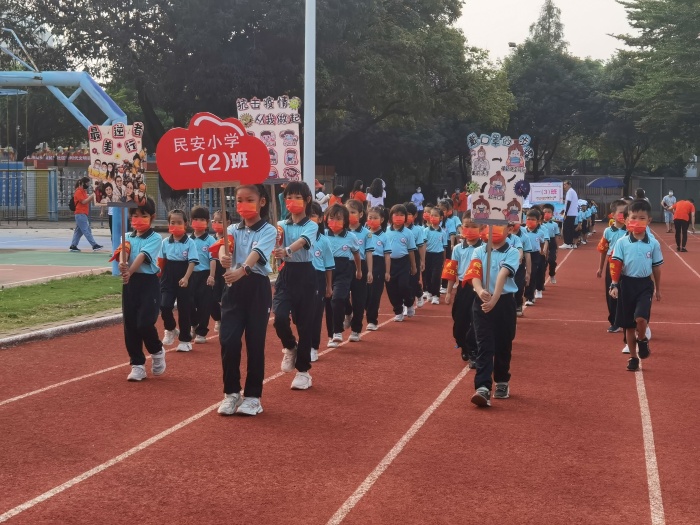 活動(dòng)伊始,舉行了本次體育節(jié)暨田徑運(yùn)動(dòng)會的開幕式。南頭鎮(zhèn)教育和體育事務(wù)中心教研員黃再玲、郭淑娟、姚利芳,南頭鎮(zhèn)關(guān)工委副主任黃祺宗、委員梁細(xì)言,南頭鎮(zhèn)民安社區(qū)黨委委員谷紅霞到現(xiàn)場觀看入場式。首先是進(jìn)行入場儀式,隨著運(yùn)動(dòng)員進(jìn)行曲的響起,由各班運(yùn)動(dòng)員組成的方陣,一個(gè)接一個(gè)地在響亮、整齊的口號聲中踏著整齊的步伐經(jīng)過主席臺,誠懇接受學(xué)校領(lǐng)導(dǎo)對他們的檢閱。激昂的口號,鏗鏘有力的腳步聲,全校三十個(gè)班級精神抖擻,神采飛揚(yáng),排著整齊的隊(duì)伍依次入場,充分展現(xiàn)了民安小學(xué)師生的蓬勃朝氣和青春活力。最后進(jìn)場的是民安小學(xué)家長義工隊(duì)方陣,他們?yōu)榧倚D軌蚋玫暮献鞲冻隽瞬恍傅呐Α=酉聛?,是全校師生奏唱國歌。在莊嚴(yán)的升旗儀式結(jié)束后,民安小學(xué)嚴(yán)玲珍校長為運(yùn)動(dòng)會致開幕詞,她希望運(yùn)動(dòng)員們能堅(jiān)定理想信念,敢于拼搏、勇于進(jìn)取、賽出風(fēng)格、賽出水平,為班級增光添彩。在裁判員代表陳景隆老師宣誓以及運(yùn)動(dòng)員代表龔慧珊同學(xué)發(fā)言后,南頭鎮(zhèn)教育和體育事務(wù)中心教研員黃再玲老師宣布運(yùn)動(dòng)會正式開始。